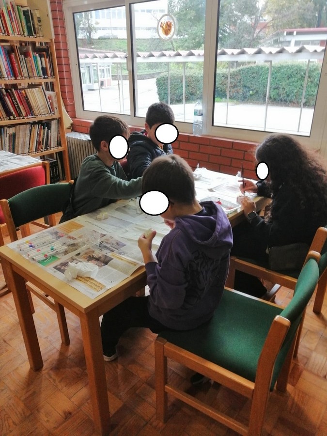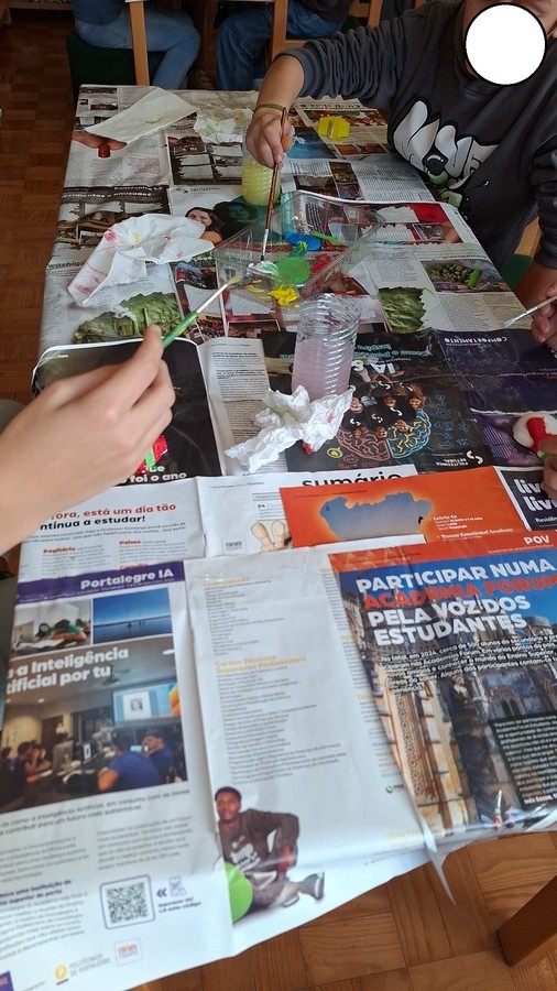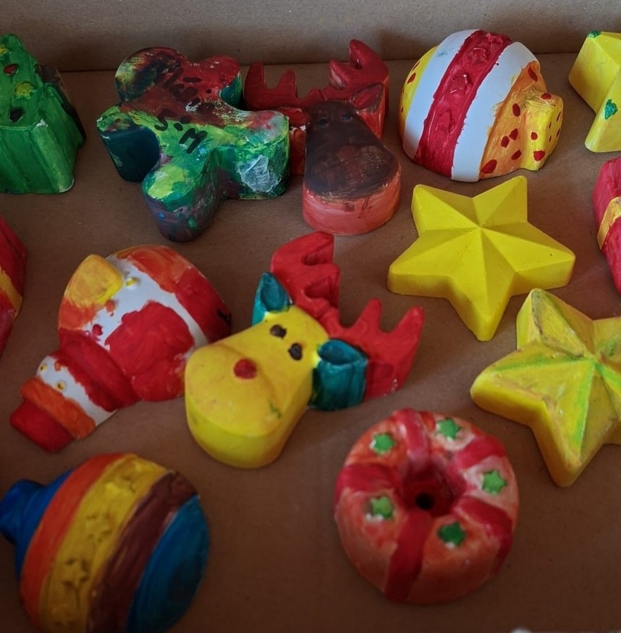 Depois do conto e da escrita, os alunos participaram numa atividade de expressão plástica. Cada um recebeu uma pequena peça decorativa feita em gesso: a estrela, a rena, o pinheirinho, o boneco de neve, o bolo-rei, a prenda e a bola, todas figuras temáticas da época. Utilizando tintas acrílicas, os alunos aplicaram a pintura, explorando cores, texturas e combinações criativas para personalizar as suas peças natalícias. Durante toda a atividade, um suave tema de música instrumental de Natal tocava ao fundo, ajudando a criar um ambiente sereno e concentrado. Os alunos trabalharam com entusiasmo, partilhando ideias entre si e orgulhando-se das suas criações únicas que levaram consigo.
