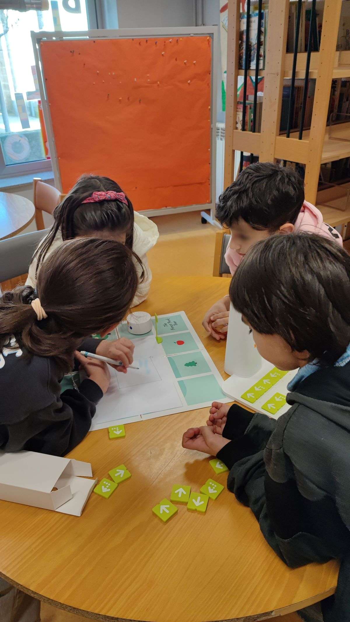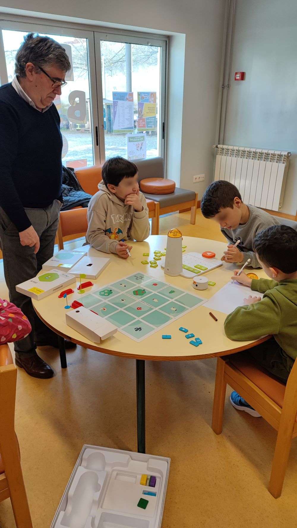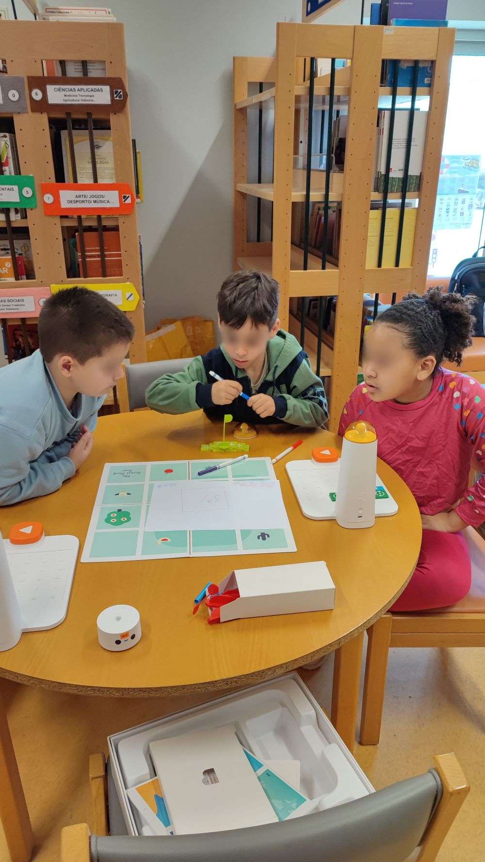 Os alunos manipularam os robôs mais simples Matatalab e Kubo criando programas básicos. O robô Matatalab permitiu essencialmente desenvolver a orientação espacial através da criação de desafios de programação de percursos simples em que os alunos tiveram de identificar e descrever posições usando vocabulário próprio como “em frente” e à esquerda”… . Os alunos compreenderam o conceito de ângulo e identificaram ângulos diversos, construindo polígonos recorrendo a ambientes de programação visual e associando os movimentos de quartos de volta, meia volta e volta completa às amplitudes respetivas dos ângulos (quartos de volta – 90º, meia volta – 180º e volta completa – 360º). Posteriormente e ainda através da programação, os alunos desenharam figuras geométricas. Constataram ainda a existência de outros ângulos que permitem desenhar outros polígonos.