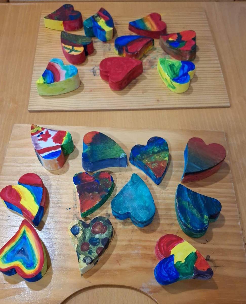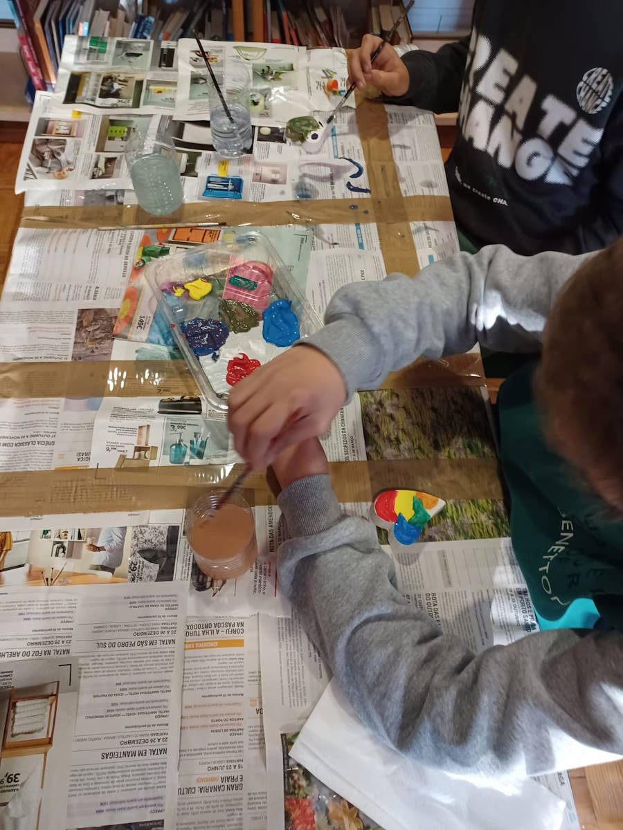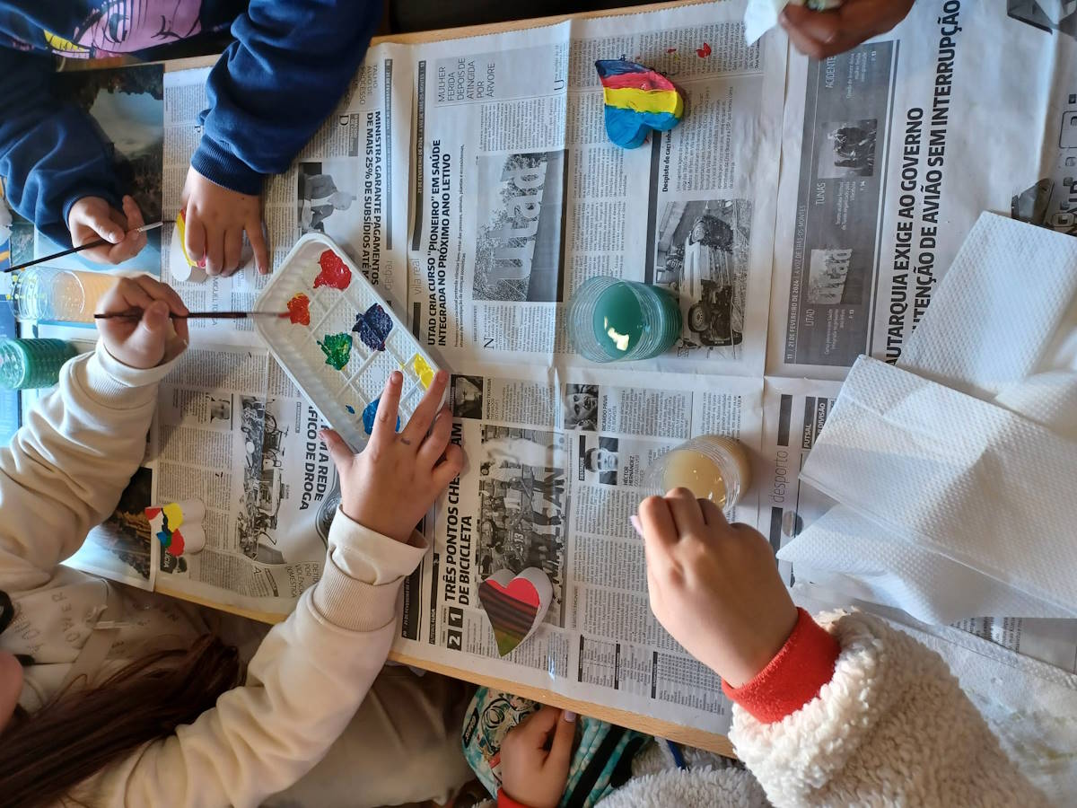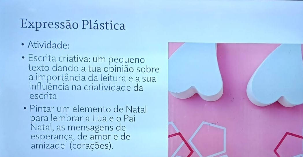 Enquanto trabalhavam, uma música instrumental de Natal ecoava suavemente, criando um ambiente de concentração, serenidade e alegria. Os corações concluídos pareciam brilhar, representando a mensagem central da atividade: a partilha e o afeto são dos melhores presentes e a interdisciplinaridade entre a expressão escrita, leitura e expressão plástica resulta em magia. Nesta atividade houve ainda a preocupação pela Educação Ambiental nos utensílios usados na atividade da pintura, todos resultantes da reutilização de objetos diversos.