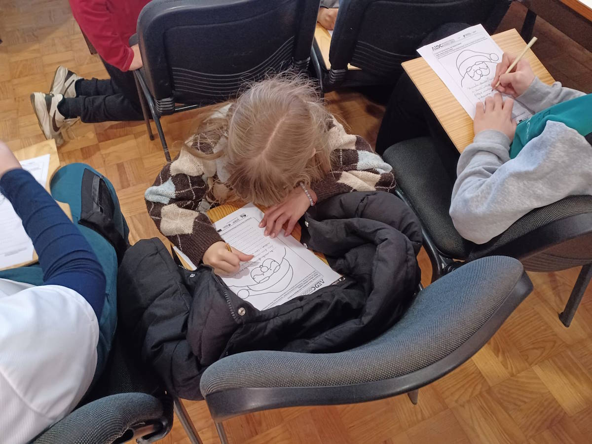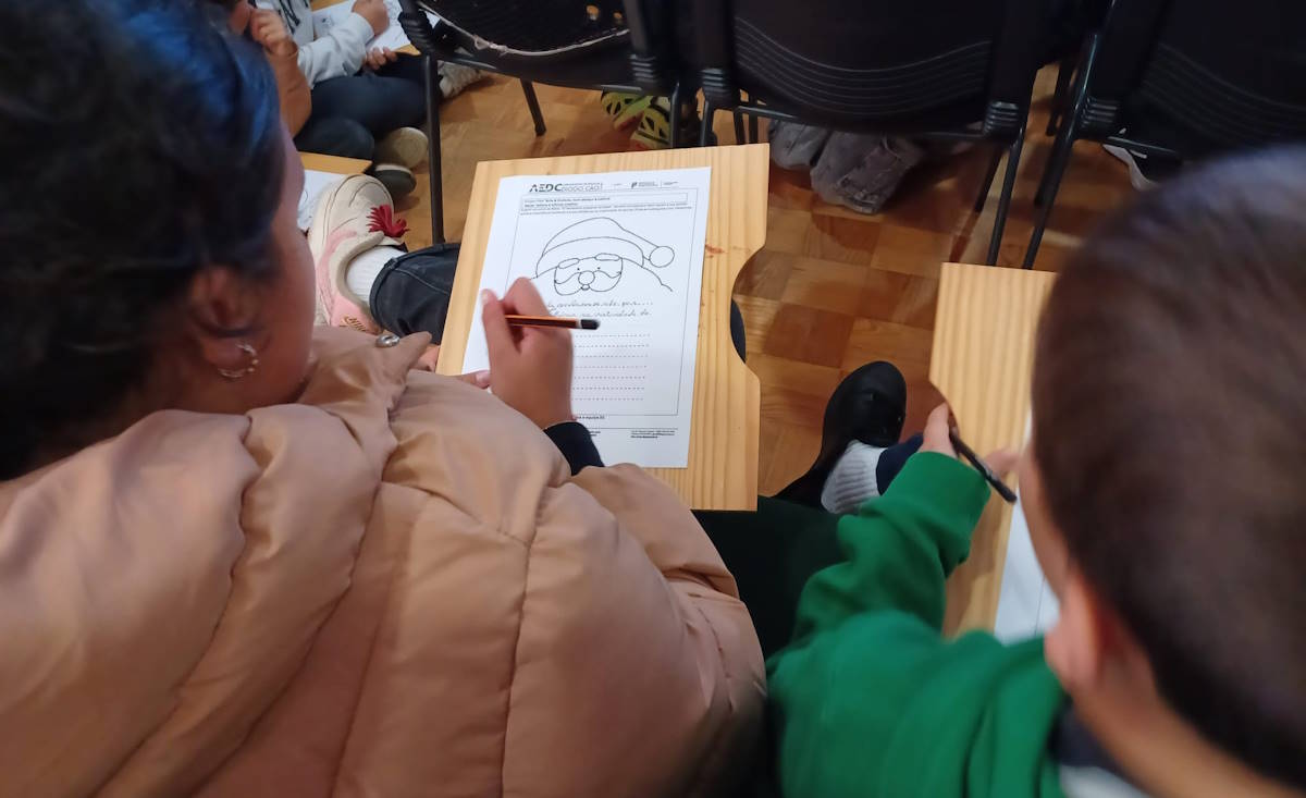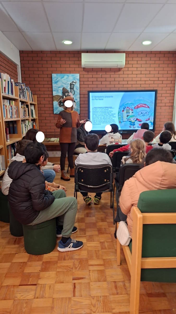 A sessão iniciou-se com a apresentação do conto original da professora Isaura Sousa (história e ilustração), “O Verdadeiro presente do Pai Natal”, em que este surge como um mensageiro de afetos. No conto, ele prepara pequenos embrulhos feitos de folhas de papel em forma de folhas de árvores, cada uma contendo palavras de carinho, mensagens de esperança, amor e amizade verdadeira. Durante a história, o Pai Natal convida uma menina a acompanhá-lo numa missão especial: juntos percorrem lares de idosos, instituições de crianças órfãs ou abandonadas, hospitais e casas onde o espírito natalício parecia esquecido, deixando esses presentes simbólicos para reacender sorrisos e memórias. A leitura envolveu os alunos, que escutaram atentamente, refletindo sobre a importância de pequenos gestos e da empatia.