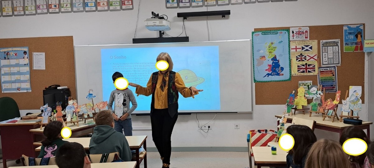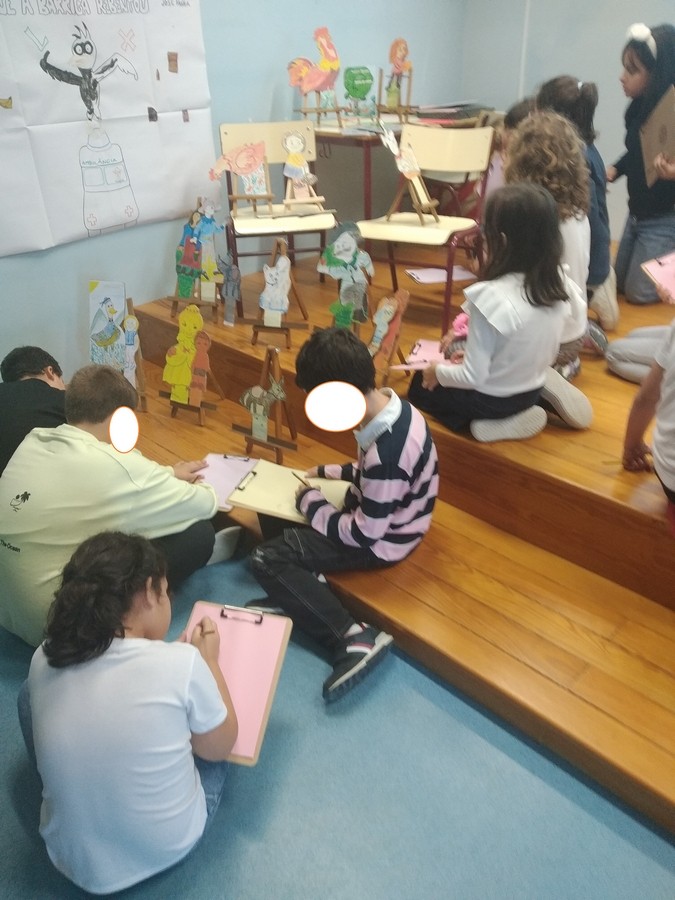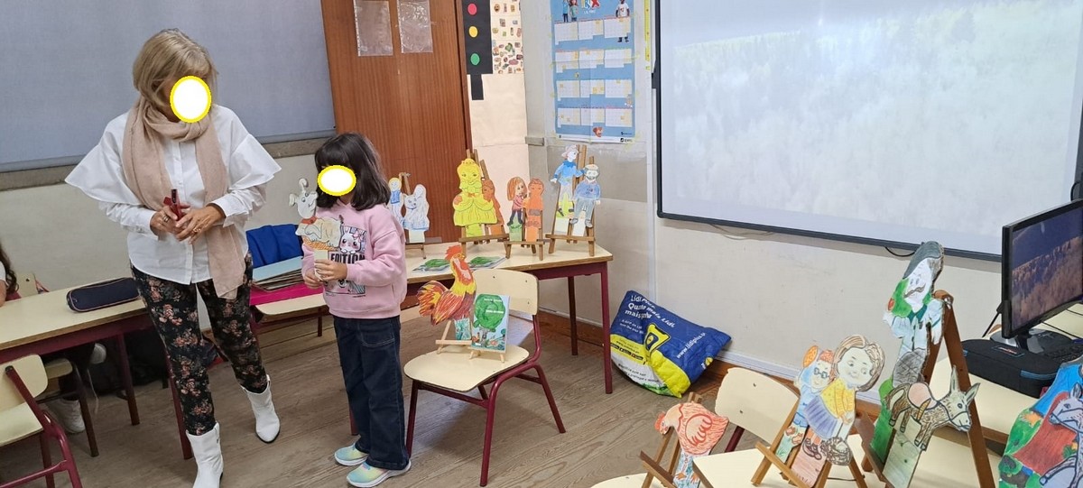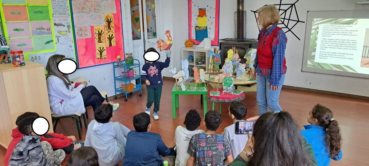 Como suporte às atividades, foram utilizados os livros “Estórias que Contam” e “Poesia Ilustrada”, e respetivos trabalhos de Artes Visuais. As personagens dos livros apresentaram-se em cartão como motivação e manipulação para os jogos dramáticos, que serviram de inspiração para a criação de textos a partir de imagens pictóricas e ilustrações de histórias. As crianças e os discentes produziram narrativas, poemas e ilustrações, participando igualmente em jogos lúdicos e dinâmicas criativas que reforçaram o gosto pela leitura e pela expressão artística.